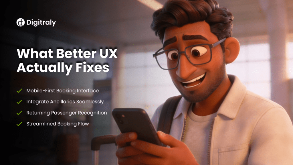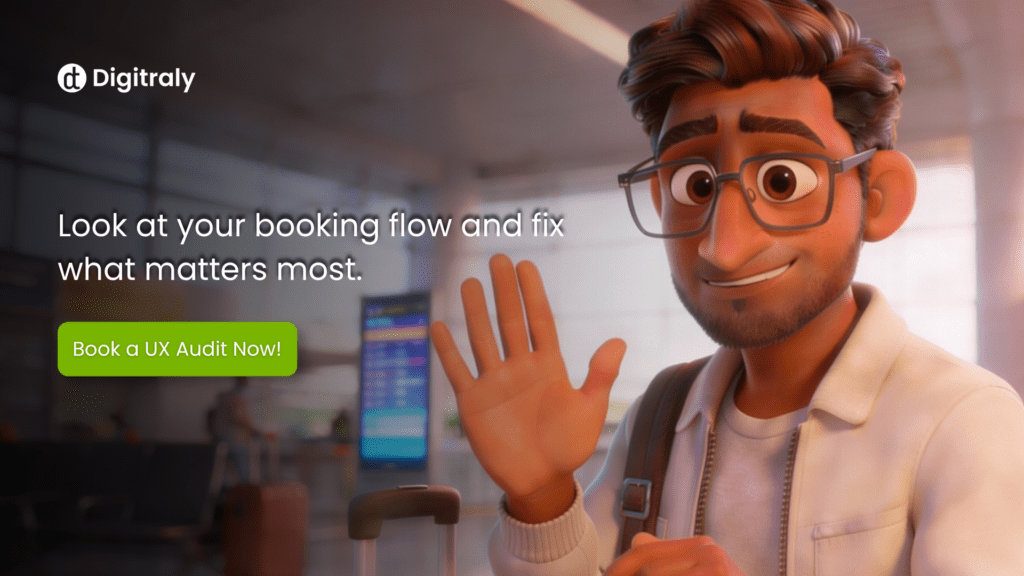 Digitraly’s airline UX design services start by identifying exactly where the current flow is losing bookings and structure the work around improving it without disrupting what is already live.